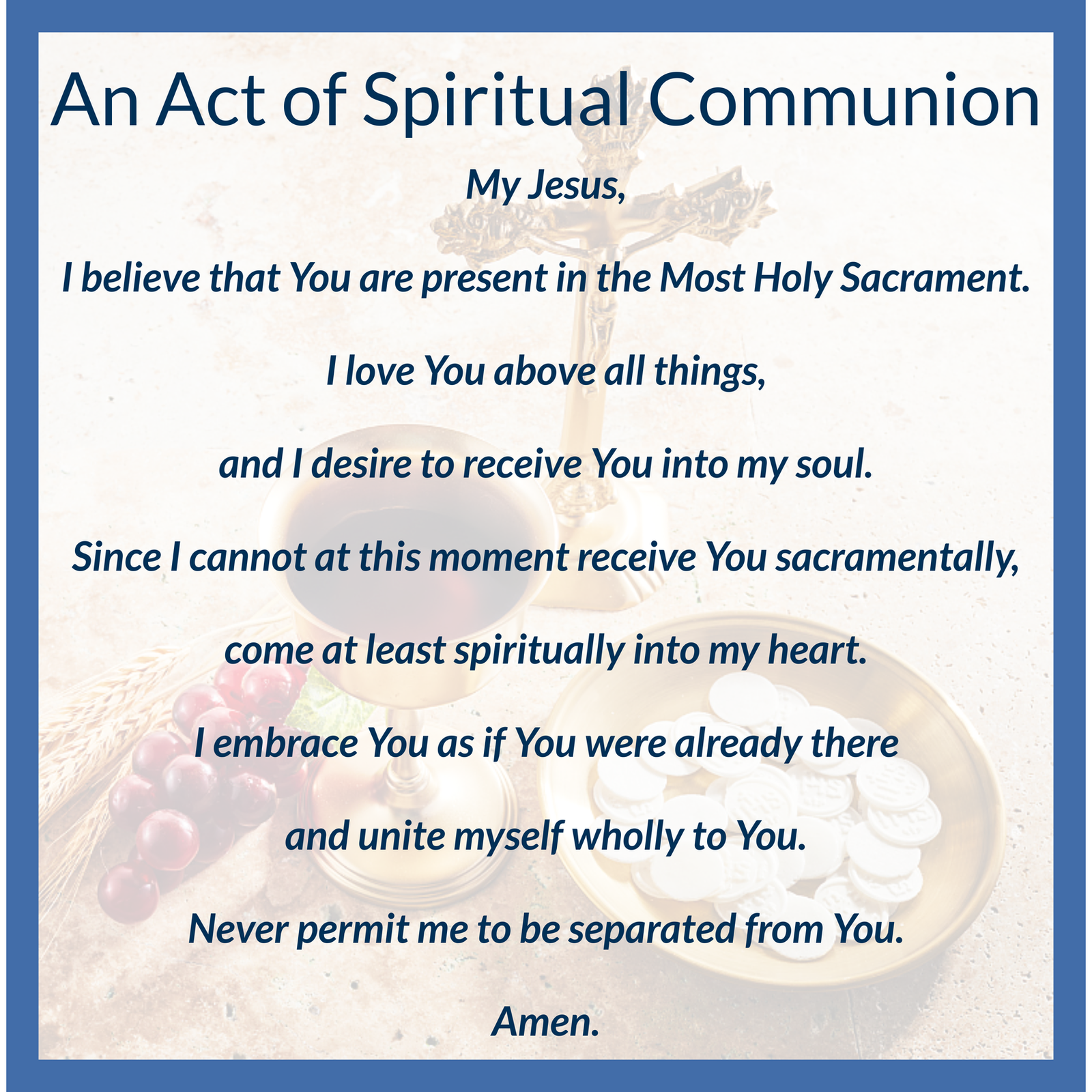 The Eucharist is our spiritual food which provides strength for our journey. If you or a loved one is home-bound, in a nursing home, or in the hospital and would like to receive Communion.